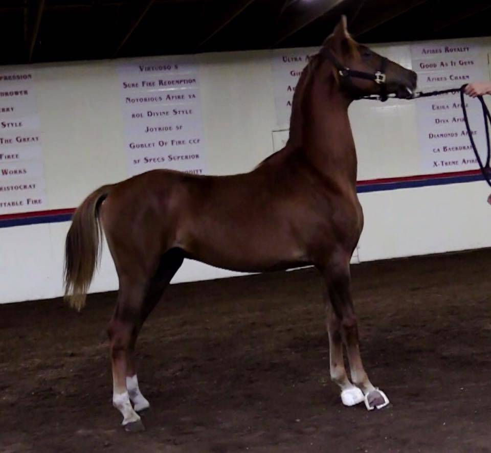2015 Half-Arabian gelding sired by Reserve National Champion SF Aftershoc (by National Champion SF Specs Shocwave); out of A Hint of Nutmeg (by the #1 Saddlebred sire Undulata's Nutcracker x Ursa Major, a Hall of Fame Broodmare).